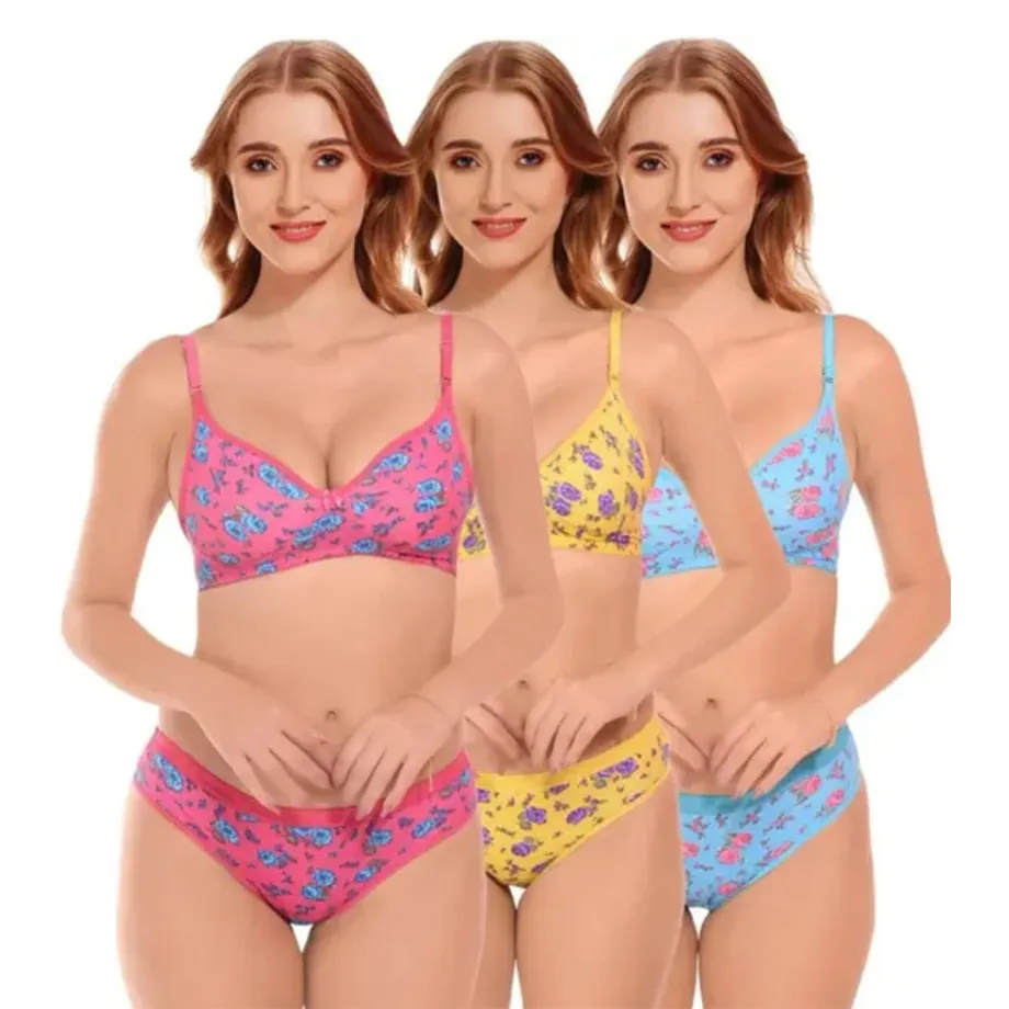 Fiore Cotton Lingerie Set – Pack of 3 (Yellow, Pink & Blue)